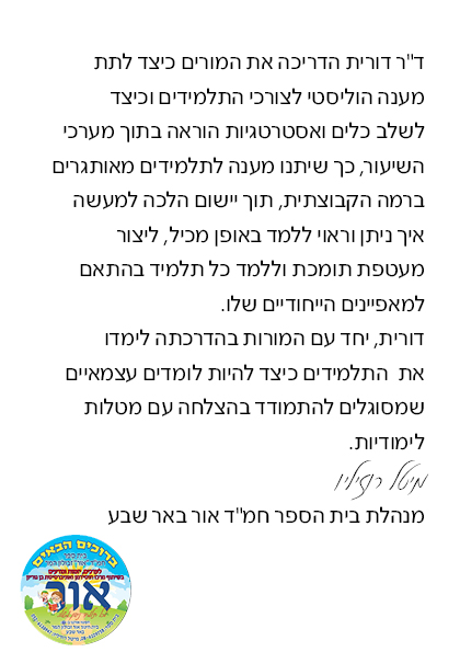 הגישה שלי משלבת ידע מקצועי ומקיף עם חיבור אישי, רגישות ואמונה ביכולת של כל ילד וכל מורה להצליח.