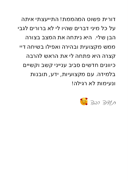 מוזמנים לקרוא עוד על השירותים שלי – להורים, למורים ולמנהלים – ולבחור את הדרך שמתאימה לכם.